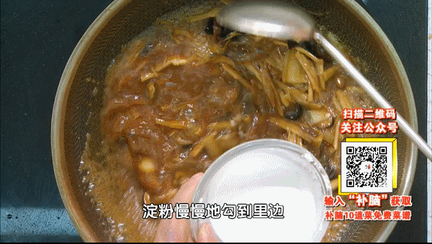 勾芡:淀粉可以选用土豆淀粉,芡汁明亮,一定不能太稀。如果你是初学者,可用绿豆粉或者红薯粉,勾出来比较浓,成功率较高。
