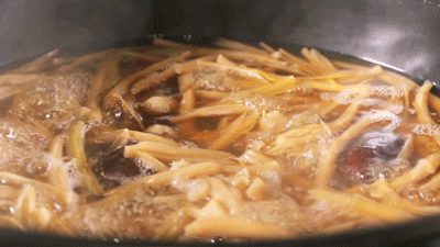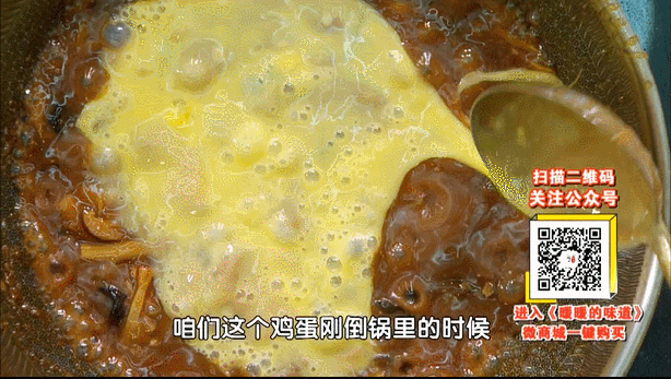 甩果:汤汁越煮越浓稠时,将鸡蛋液倒入勺子中,直接甩到锅里形成大片蛋花,加盖焖制15秒即可。临出锅补充少许花椒油和煮好的面条一拌,一碗地道的打卤面即可搞定!