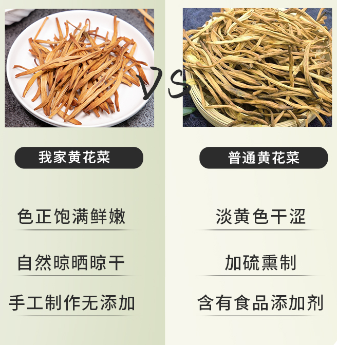 ×硫磺熏干的黄花菜:颜色通体金黄,看起来好看,但凑近闻有股刺鼻味,个头也不够均匀。