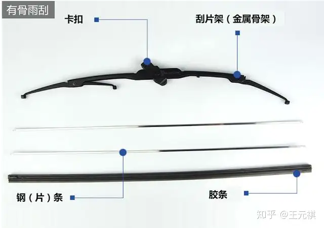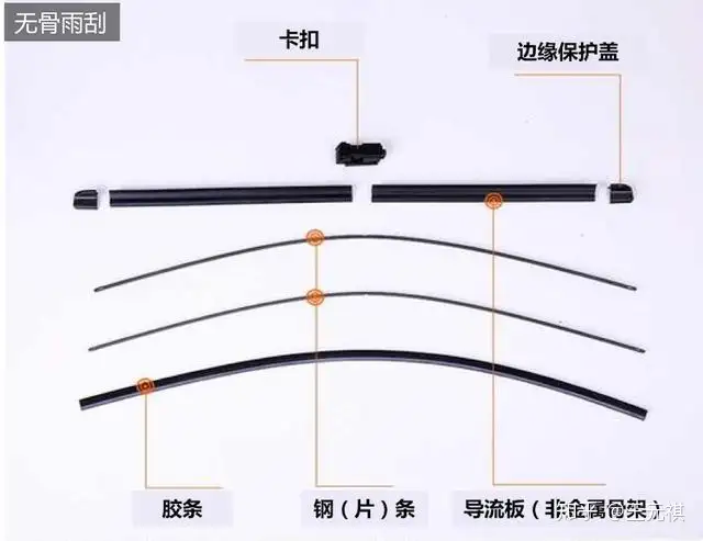 『有骨雨刮』通常是由「卡扣」、「刮片架」、「钢片条」和「胶条」组成。「卡扣」是将「雨刮」与「雨刮臂」连接,种类繁多,我们此后详解。