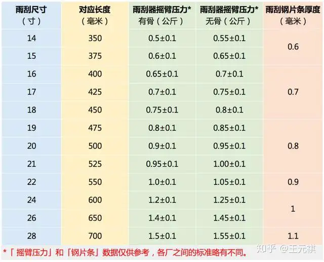 关于「雨刮」的尺寸,说白了就是这根粗黑棒有多长,以我自己的车为例,主驾驶位置那根长的是26寸,副驾驶位置那根短的是22寸,你可以拿把尺量一下,然后对照上面的表格看看是多少,或者记住换算的方法:1寸=25毫米。这步非常简单,我就不开一个小节了。