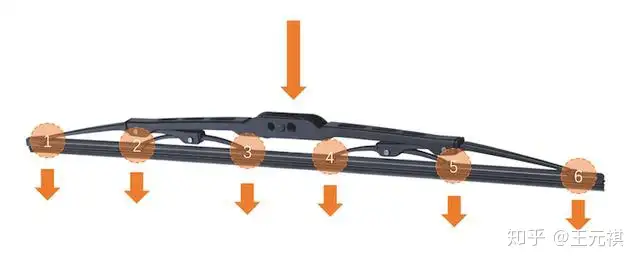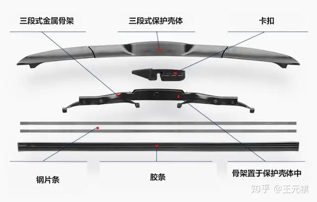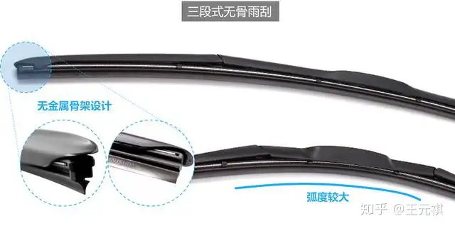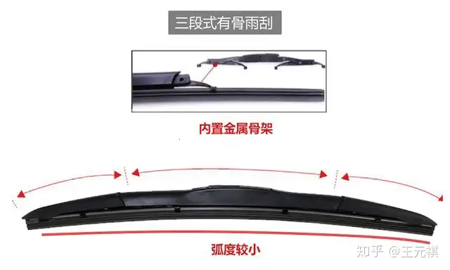 其实『三段式雨刮』也分『有骨』与『无骨』,比如上图中的『三段式有骨雨刮』,其结构相比传统的『有骨雨刮』,优化了3点:
