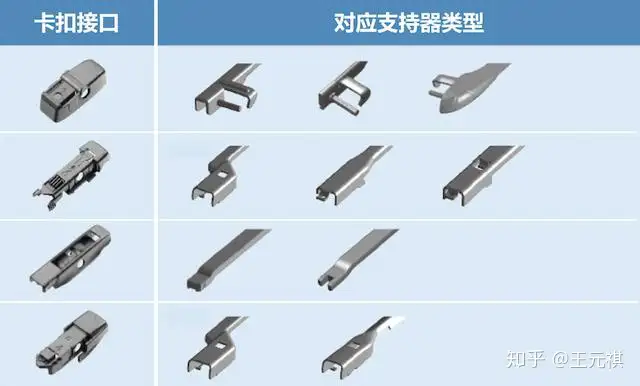 对小白车主来说「卡扣」的接口形状简直就是『噩梦』,但其实挑选「卡扣」非常简单,由于「雨刮臂」顶端的「雨刮支持器」并没有给你很多选择,所以,对一般的车主而言,你基本没得选。