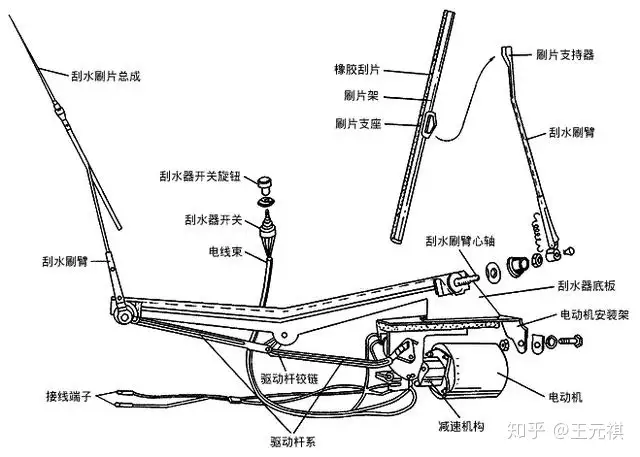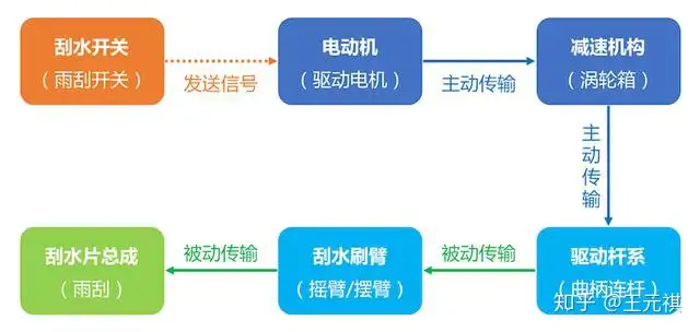 当我们详细了解了「电动雨刮」结构后,其工作原理就比较好理解了,我想通过上面的动图和简单工作流程图,大家基本都能看懂。一句话『电动机转,连杆带,雨刮摇』。当然还有其他类型的「雨刮器」,这里不展开赘述。