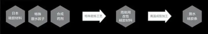 「硅胶胶条」渗透的纳米镀膜涂层,通过「硅胶胶条」干刮玻璃将纳米涂层涂抹在前档玻璃上(即为「镀膜」),从而造成雨水滴到前档玻璃马上滚落下来,业内称为「荷叶分子效果」。
