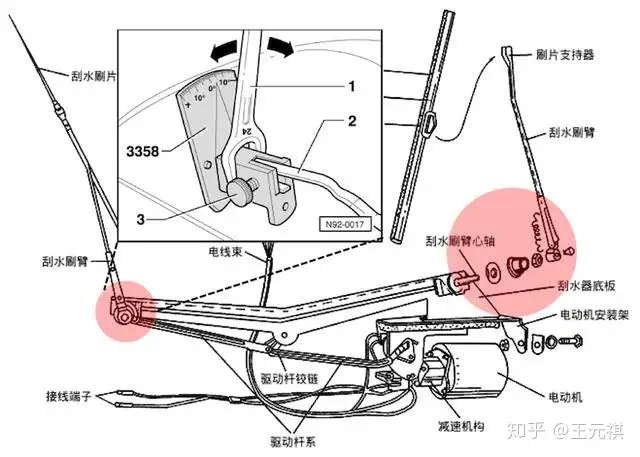 1. 多数异响都是由于「雨刮臂」的臂头松动造成的:尝试拧紧,看看是否还有异响,如果异响变小,继续微调,直至没有异响即可;