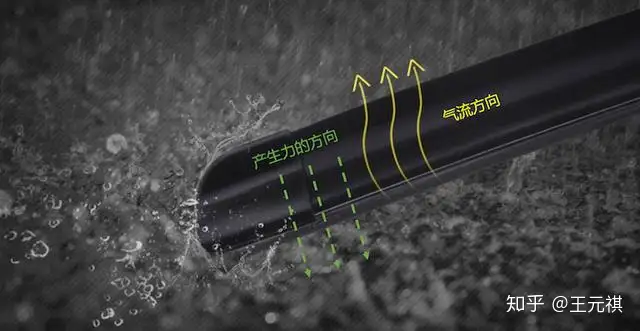 通过对『混合塑料骨架』迎风面的『坡形』设计,利用气流产生的「下压力」,使得整个「雨刮」被『压』在玻璃上,解决『无(金属)骨(架)』的压力不足问题。故此,『混合塑料骨架』也被我们称为「导流板」。