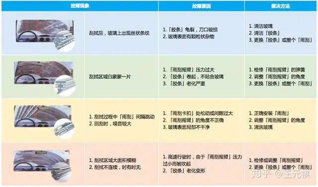 上图标注了3大类主要造成刮不干净的故障点,其中机械故障多为人为的安装问题,而「电动机」的故障多为事故造成。而最常见的原因就是「雨刮」(刮水刷片总成)老化或磨损造成的。若我们将实际情况与故障点对应时,我汇总了一张表(下图)