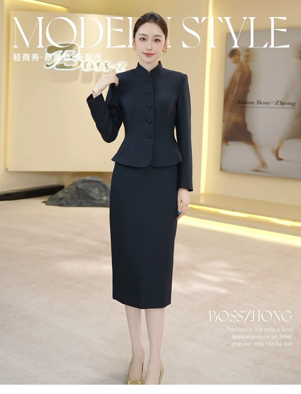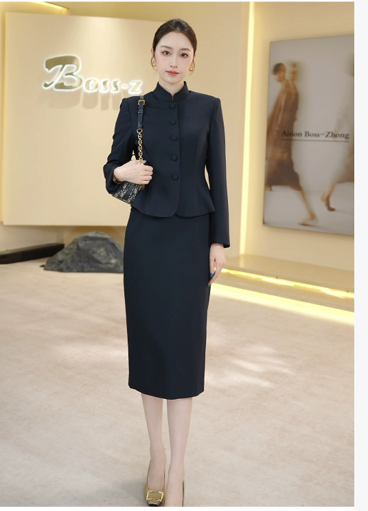 这套藏蓝色西装外套+无袖旗袍领连衣裙的组合,以“传统元素现代化,职场穿搭艺术化”的设计巧思,为追求高级感与文化底蕴的职业女性,打造出一套兼具东方韵味与国际视野的穿搭方案。