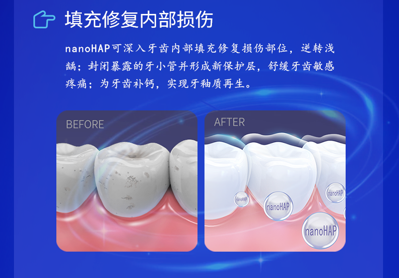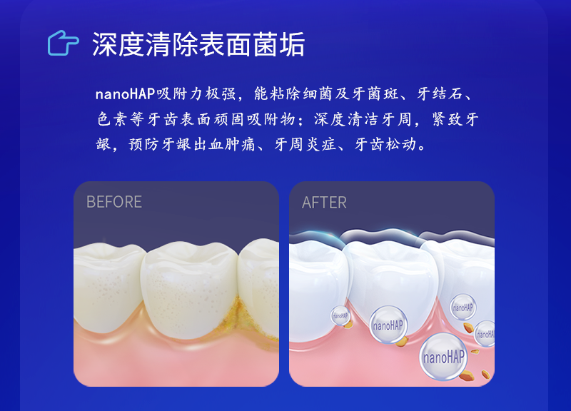在刷牙过程中,nanoHAP能有效吸附在细菌、牙菌斑牙结石及色素上,刷牙摩擦时,能够轻松去除牙齿表面的牙垢、牙渍、牙菌斑和牙结石,从根源上解决牙齿松动、牙龈肿痛的问题。