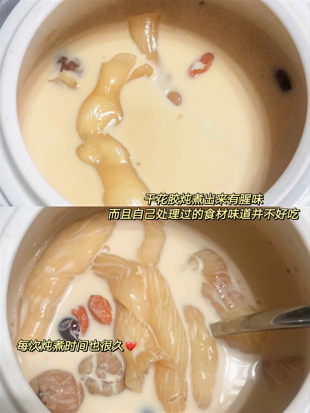 干花胶炖煮出来有腥味,有些人还接受不了这个味道,而且自己处理过的食材味道并不好吃。每次炖煮时间也很久