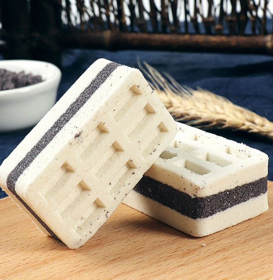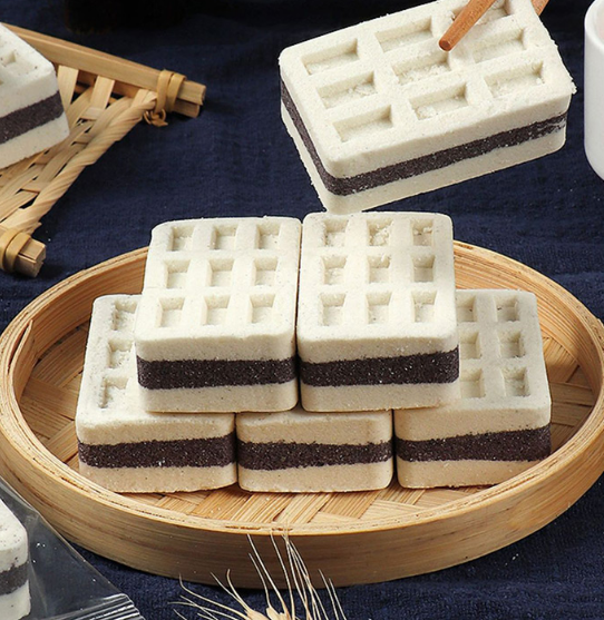 黑米芡实糕,不添加蔗糖,撕开透明的包装,一层洁白细腻的糕点,一层黑色诱人的夹心,一股淡淡的清香。