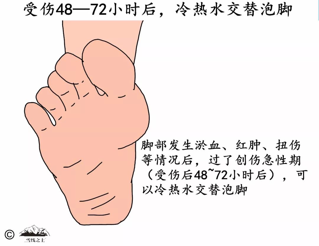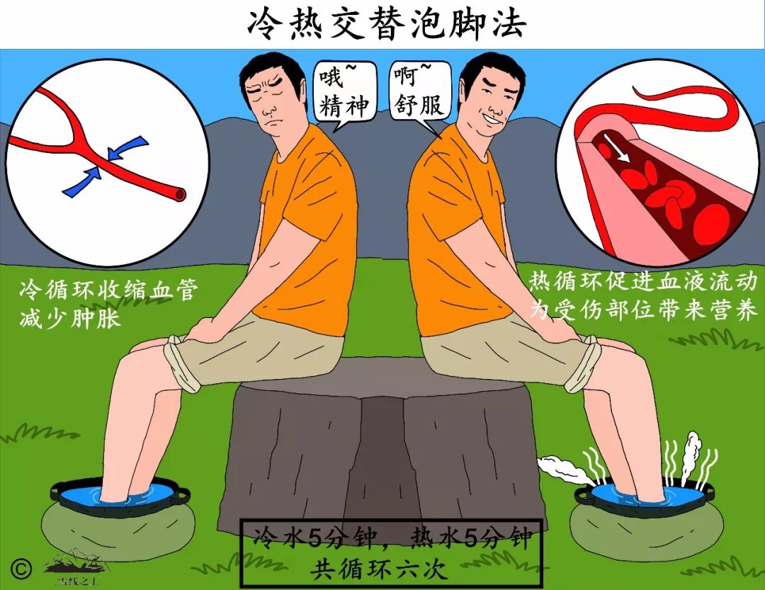 对于足部伤病过了创伤急性期的山友,可以考虑采用冷热交替泡脚法,加速修复。