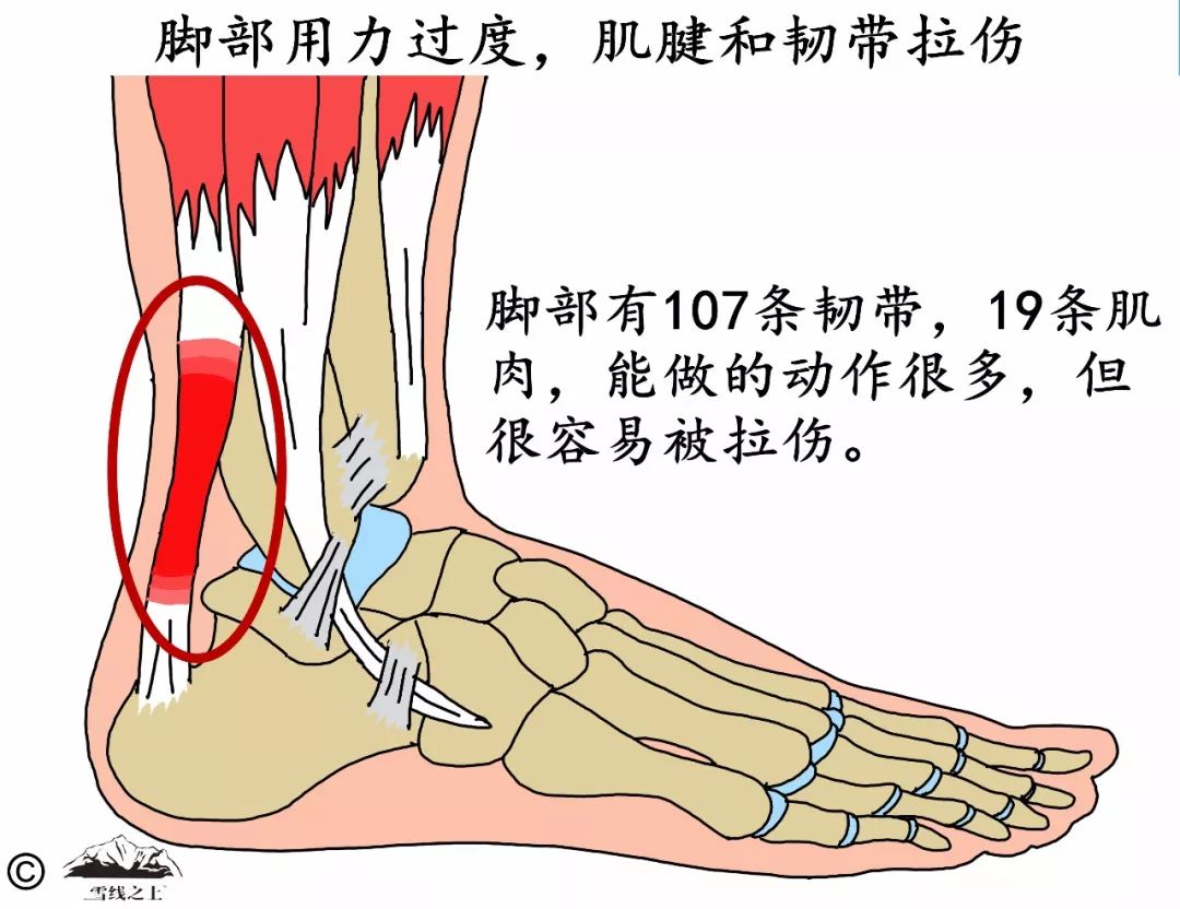 不只是撞击,突然间的用力过猛,或者是一天内运动量超负荷,也可能导致肌腱和韧带拉伤,最常见的就是脚踝扭伤。