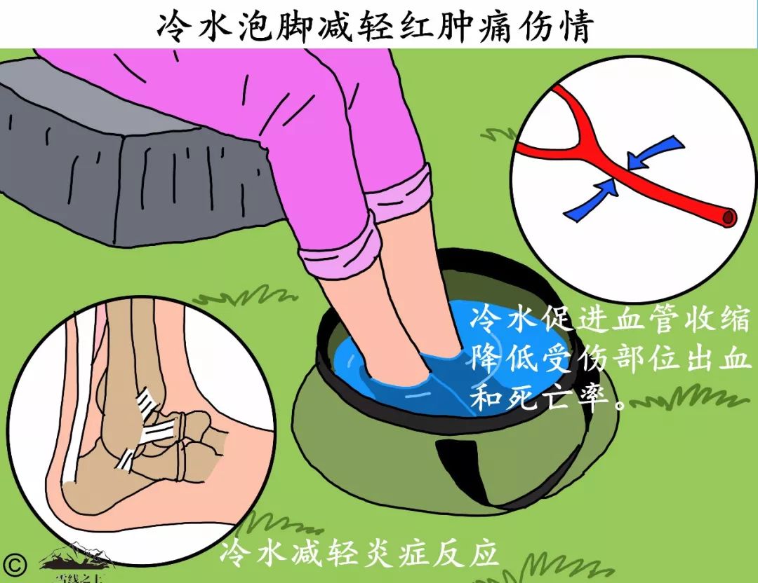 适时的冷水泡脚可以降温、帮助患处恢复,适合脚部刚刚受伤(瘀血、红肿、扭伤等)的山友。