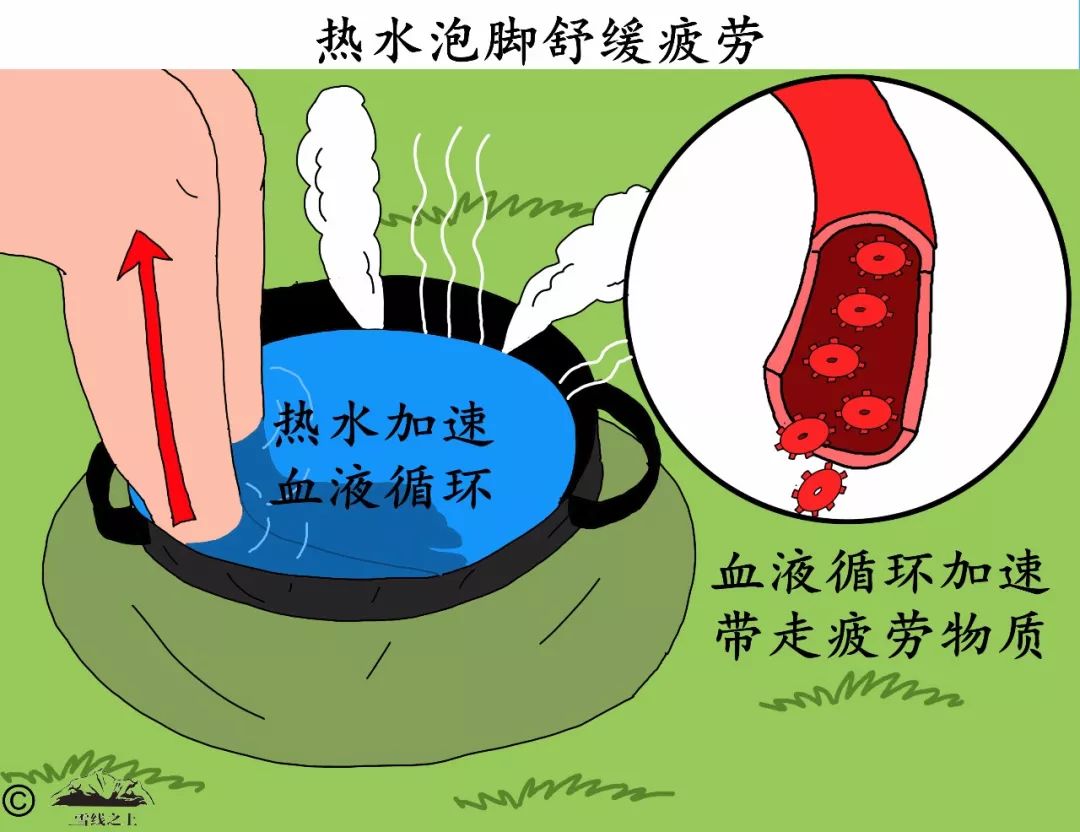 一天登山结束后,足部即使没有受伤,也会积累很多疲劳物质,热水浸泡双脚能够有效的增强血液循环,带走疲劳物质,从而使人感到轻松舒服。