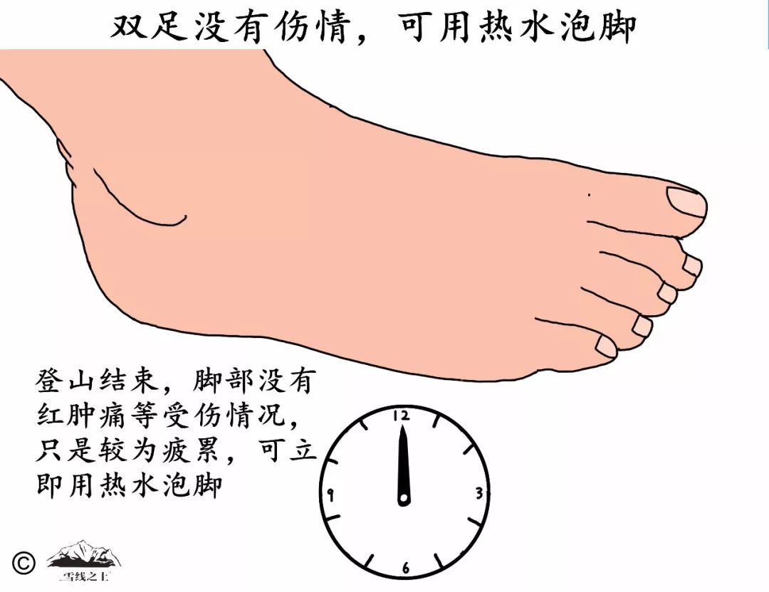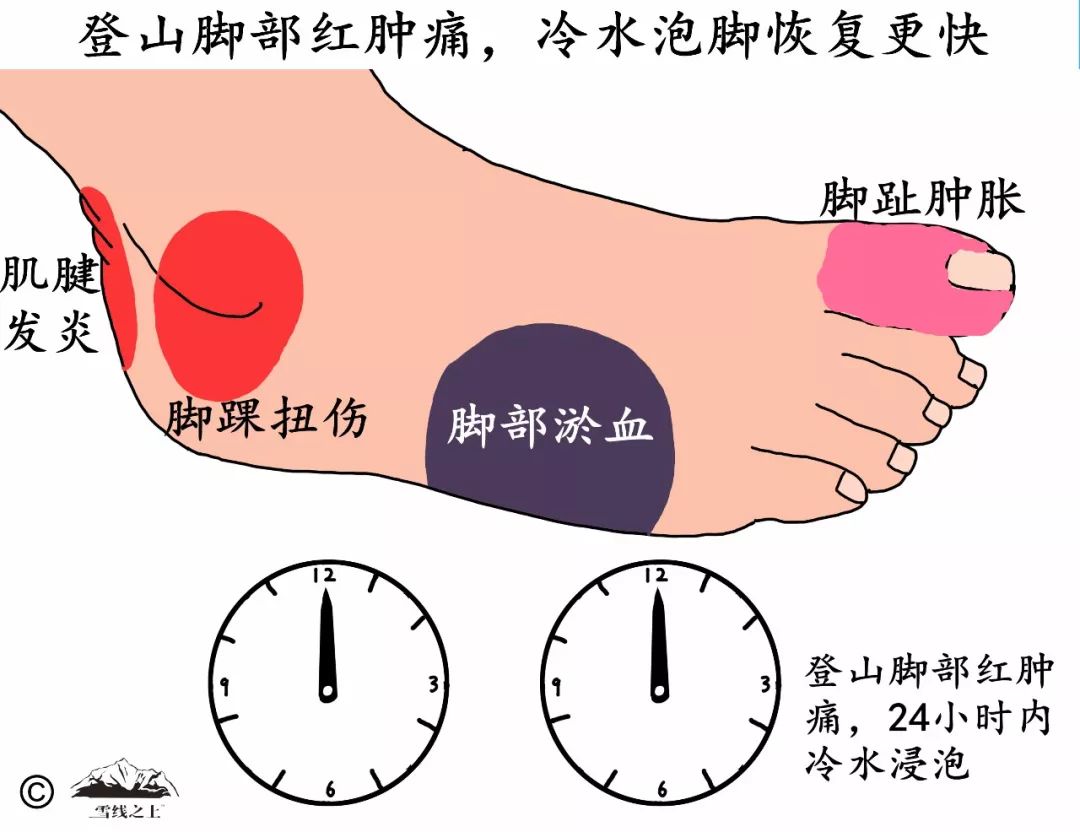 所以,如果你登山结束后发现足部皮肤泛红并且有肿胀,触摸起来疼痛,或者是发生了扭伤,就可以考虑用冷水泡脚。