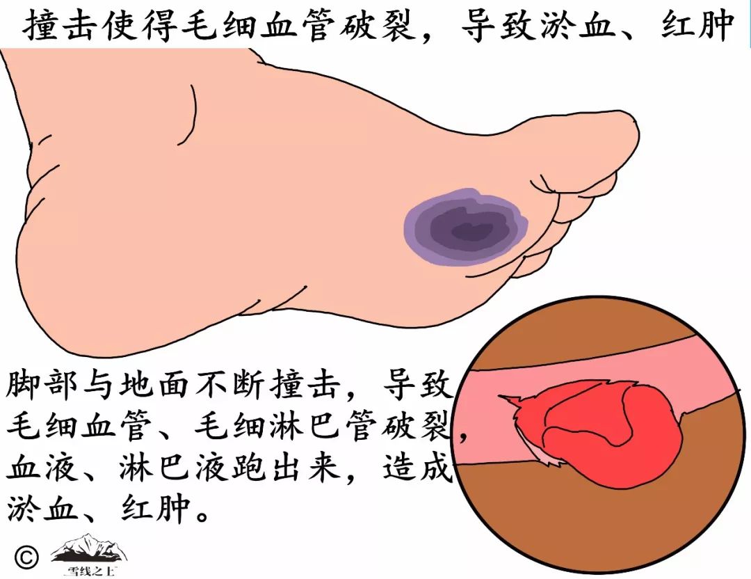 正常情况下的撞击双足是可以承受的,但是当遇到路面太硬、背负的物资过重、鞋袜没选好等情况时,就可能因为撞击过度导致毛细血管、毛细淋巴管破裂,血液、淋巴液流出,足部出现血肿、红肿等现象。