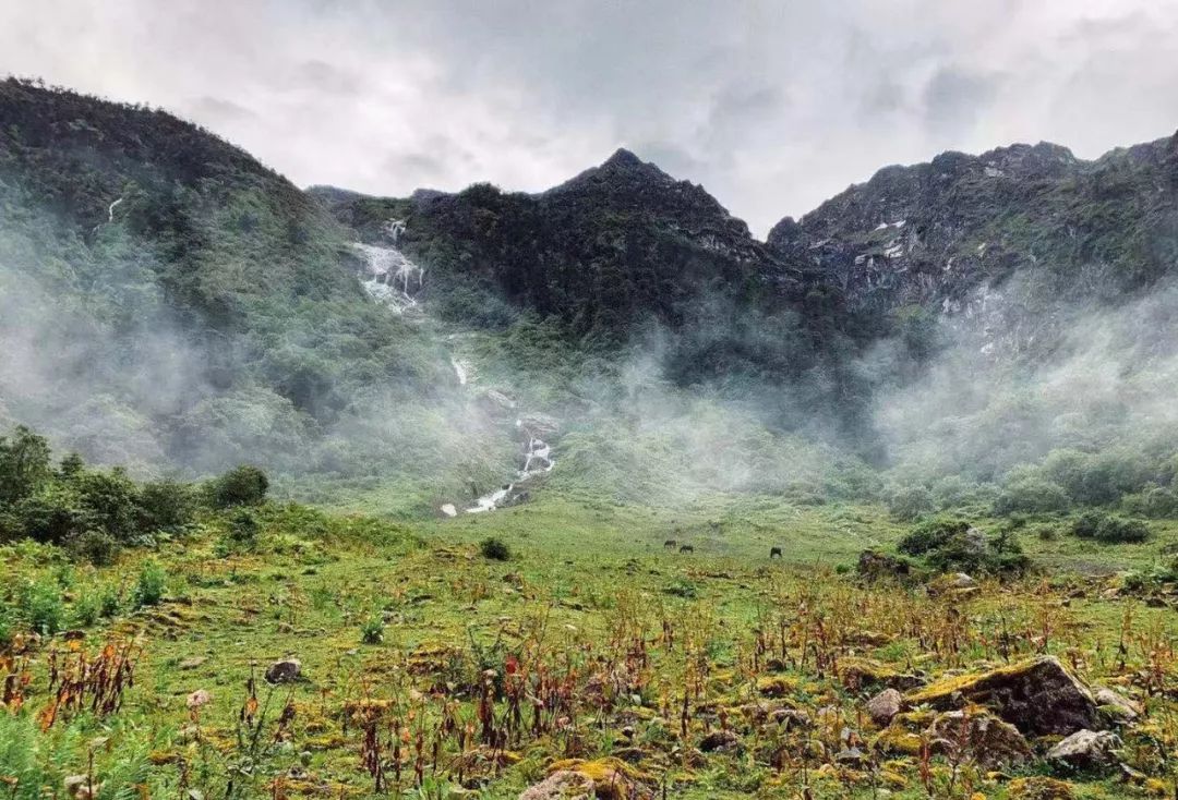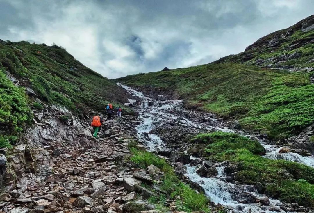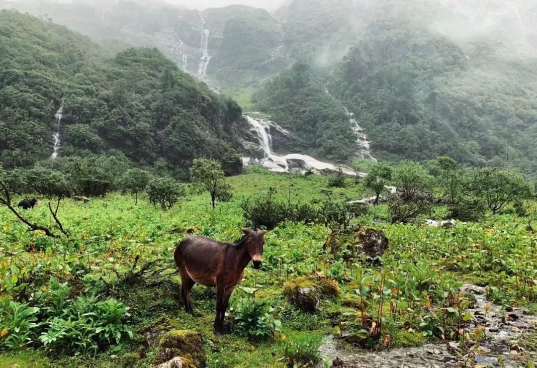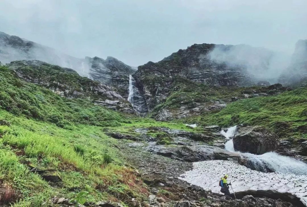 高山草甸,冰川融水相伴在侧,无数条瀑布垂下,水流飞溅,巨大的水声就在耳畔。不过对于过水这件事,我们已经游刃有余了,这里的水温我们真的有点儿低估了它的实力,冷到疼那种,过水之后也只剩骂街了。