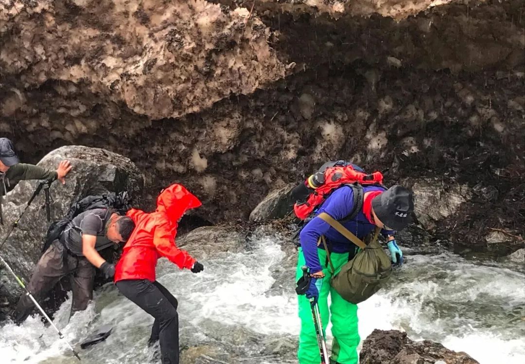 找路的过程中,老大发现下面的路更好走,只是要过那湍急的河水,你一个不站稳就去了印度。说实话我听到那水声,多少有点儿肾虚。不过看到苍狼,老大和姗姗各站一个点,依次接过队员辅助过水时,我硬了起来。毕竟苍狼,老大和姗姗如同主锁一般坚固牢靠,就是那种他们掉水里,也不会让你掉水里的人。脱臼的大福,我想她是慌的一笔,一手暂时残疾,外加之曾经的岁月一心扑在教育事业上无法自拔,励志不成仁便杀人的豪言壮举,错过了老大的很多次,但依然是老大的“八万粉丝”。对于粉丝的宠溺,老大跳入湍急刺骨的水中,把她抱过来,我站在对岸确实很感动,这是粉丝福利对吗?这应该是情义更上一层楼吧,我们万万没想到大福姐另一只手的威力,老大帽子被她带入水中,没关系;当我们再次回看照片时发现,按着老大的头入水可还行。每每长线,路上所有的疑难杂症,总会被一一破解,很傲娇地认为自己的选择是超正确的,选择了一帮智友。同时也感恩自己遇到这样一群有胆识,有勇气,有情,有义的人。