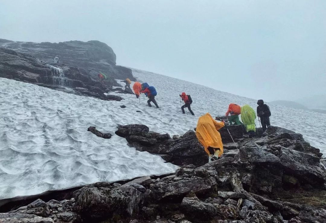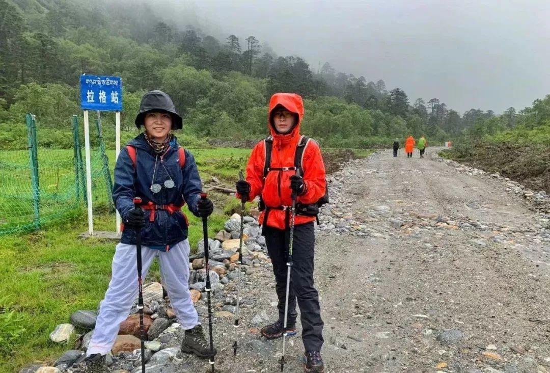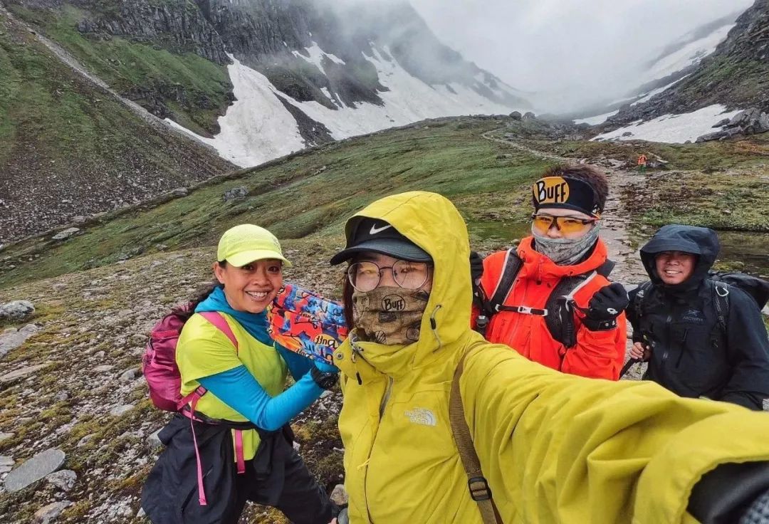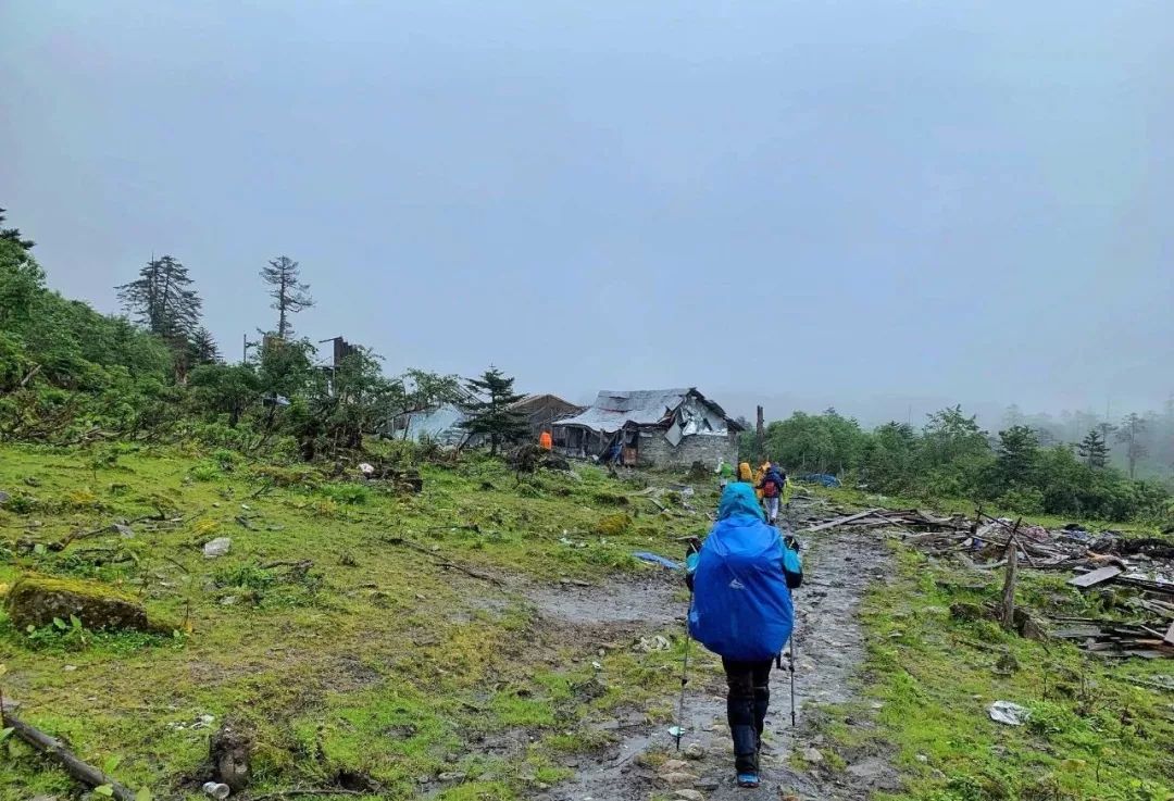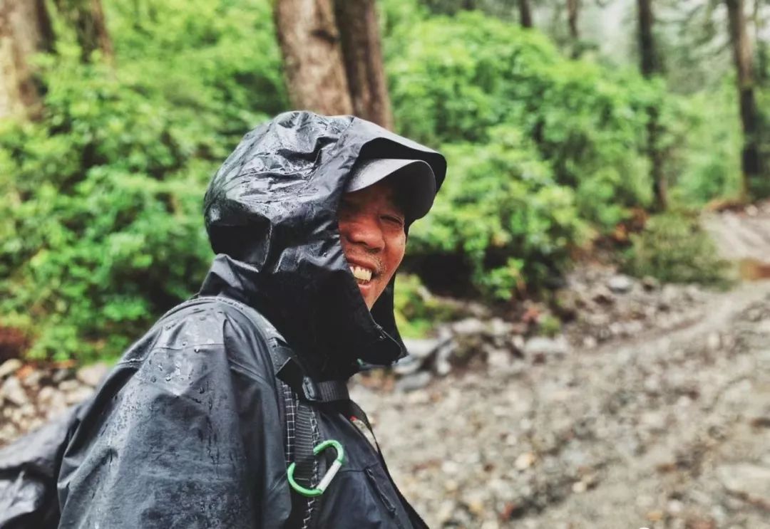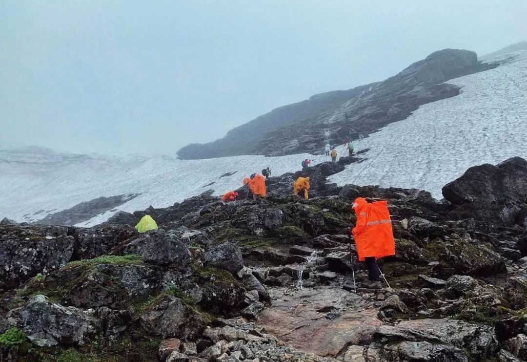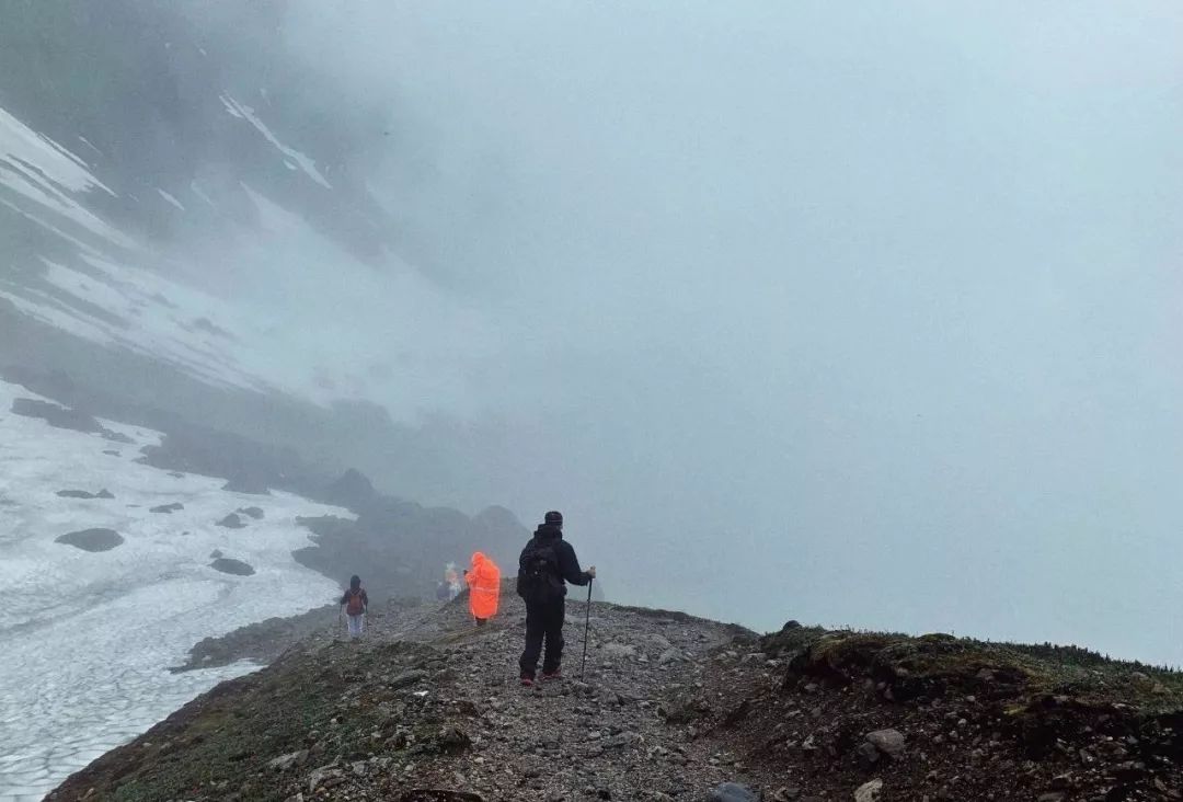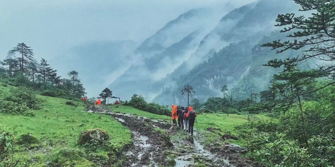 当我们翻越多雄拉时,雨一直下,道路湿滑,时而会在雪上行走。这时就体现出领队的魅力了,左右护法那种保护着队员翻越。
