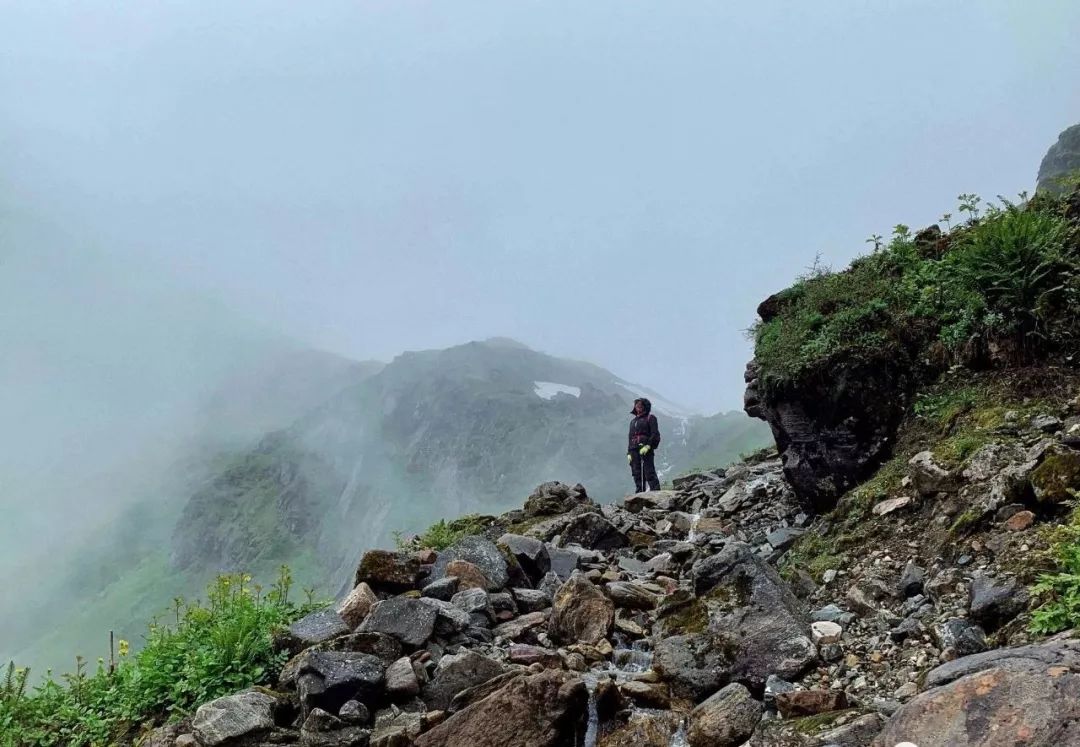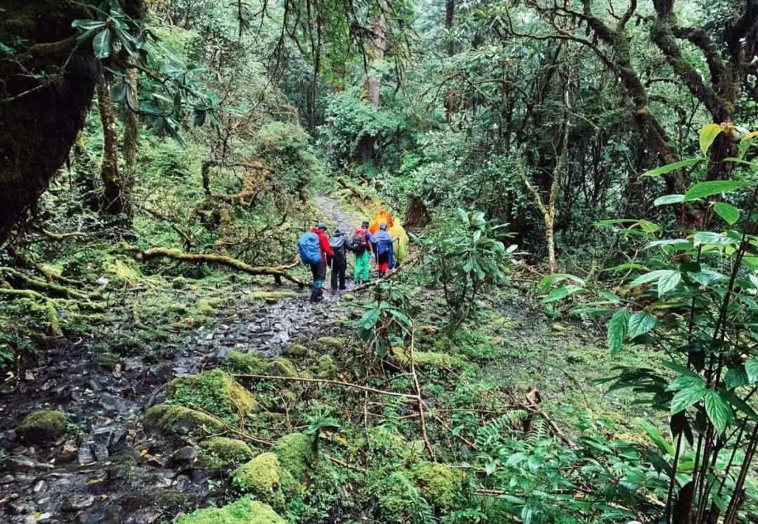 雪山脚下疯长着热带雨林,云气蒸腾的峡谷深处。确实有一种身体在地狱,灵魂在天堂。我终于明白了上山容易,下山难这句至理名言了,我们从多雄拉一路下降900米,一路碎石伴着小雨,湿滑之难走。大家互帮互助,灰常有爱地安全下降。