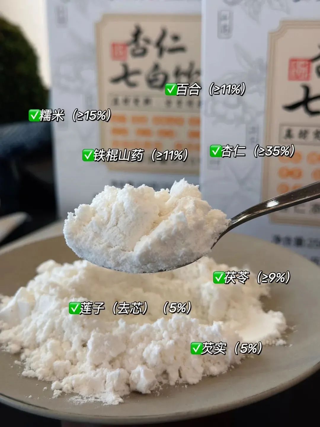 它严选杏仁、糯米、铁棍山药、百合、茯苓、莲子、芡实这七种白色食材,经现代工艺研磨成细腻粉末,独立小包装,随时随地,只需一冲,即可享受。