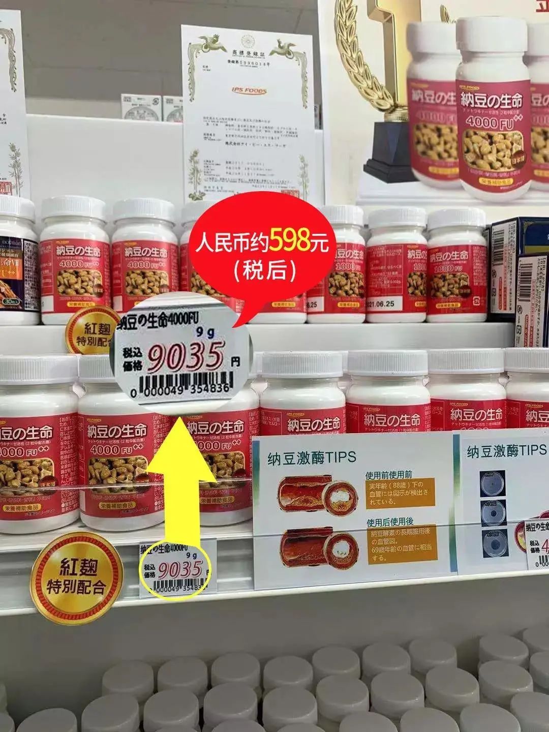 这款日本纳豆激酶在日本药店里面销售价折合人民币高达598元;