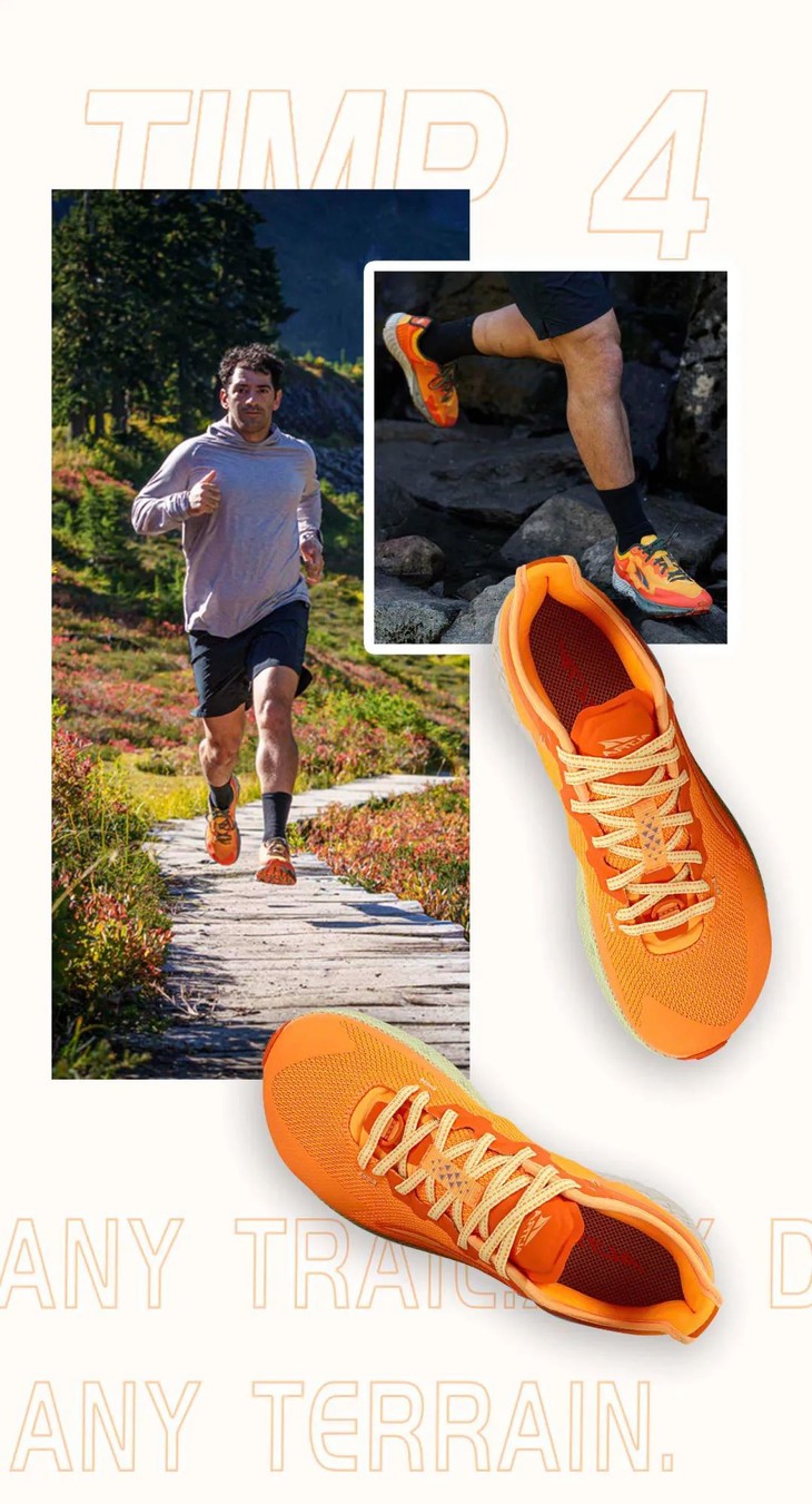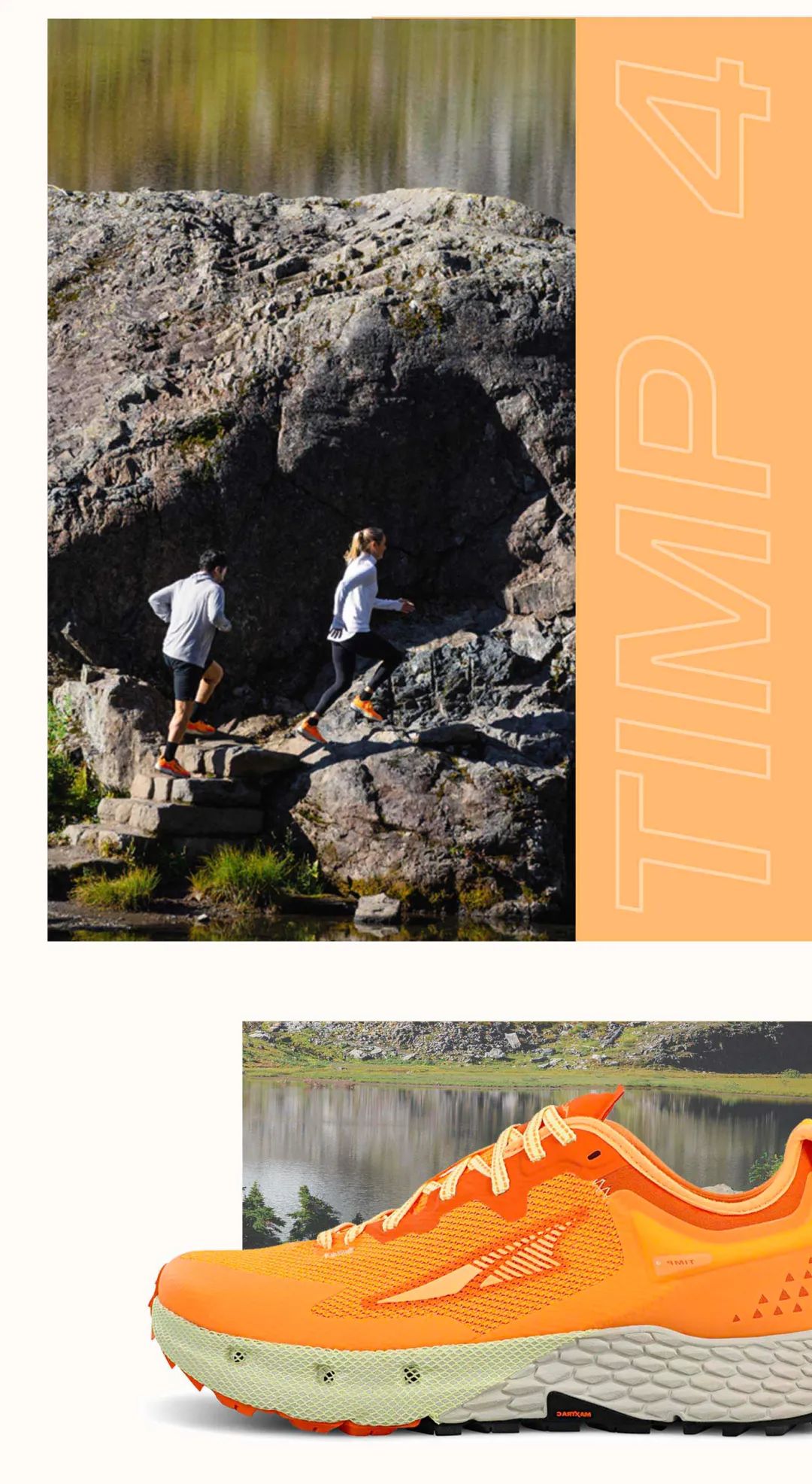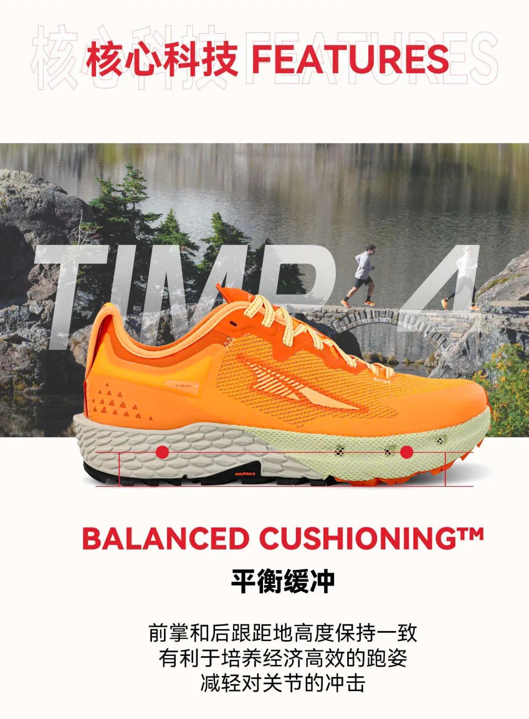 Timp 4 的中底采用Altra EGO Max 泡沫的减震设计,通过增加步幅的弹性以及提高整体舒适度和响应能力来提升越野体验。中底柔韧柔软,而后跟泡棉稍硬一些,在不平坦的地形上增加了一点稳定性。