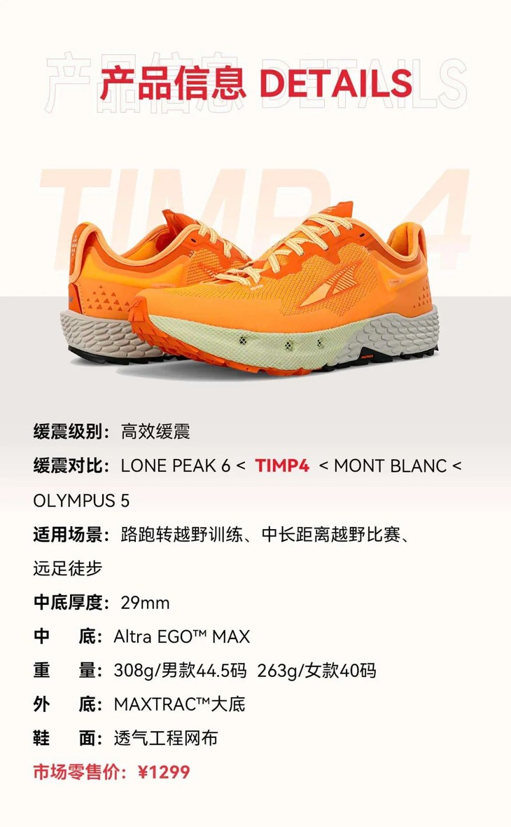 Altra在2018年时推出了全新系列Timp,堆叠高度为29mm,高于Lone Peak的25mm,小于Olympus的36mm,这与其定位一致!