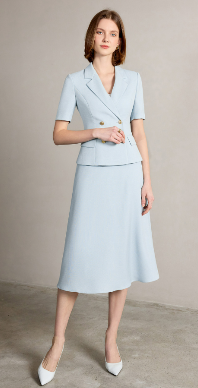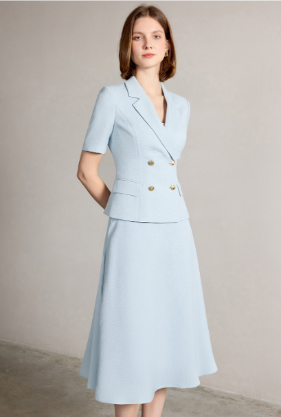 💙 邂逅这抹浅蓝西装套裙,宛如遇见职场中的优雅缪斯。短袖西装,利落的剪裁,是职场气场的完美诠释。双排金色纽扣,恰似星辰点缀,为简约的设计增添华丽感,瞬间提升精致度🌟。