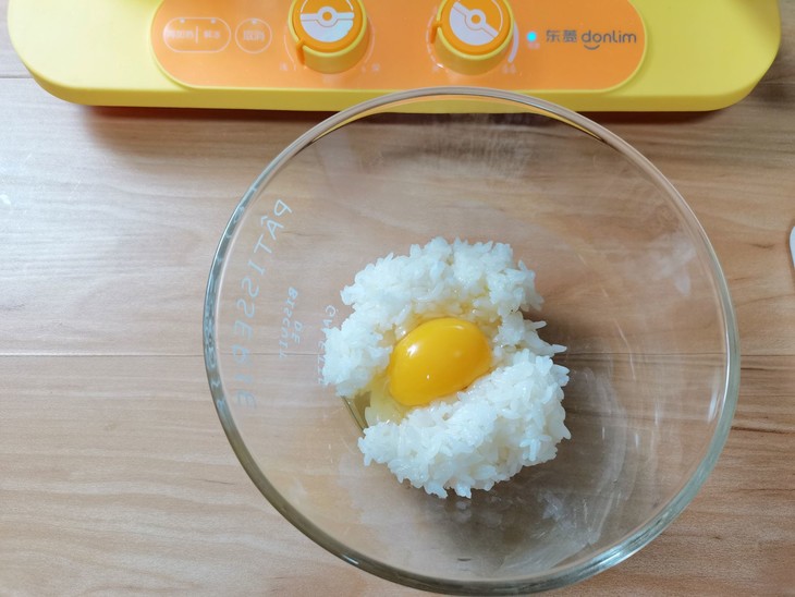5、米饭打入一个鸡蛋搅匀。