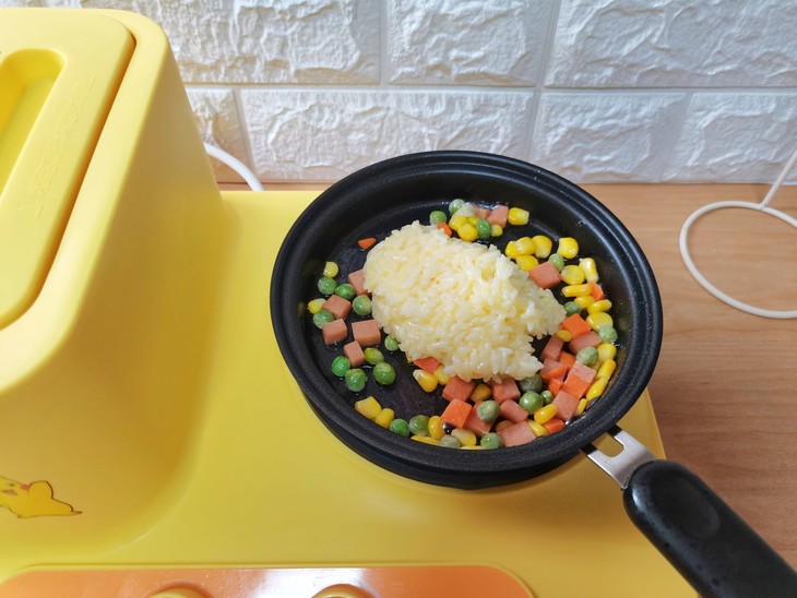 6、锅内再放少许油,加入什锦蔬菜和午餐肉丁炒熟。