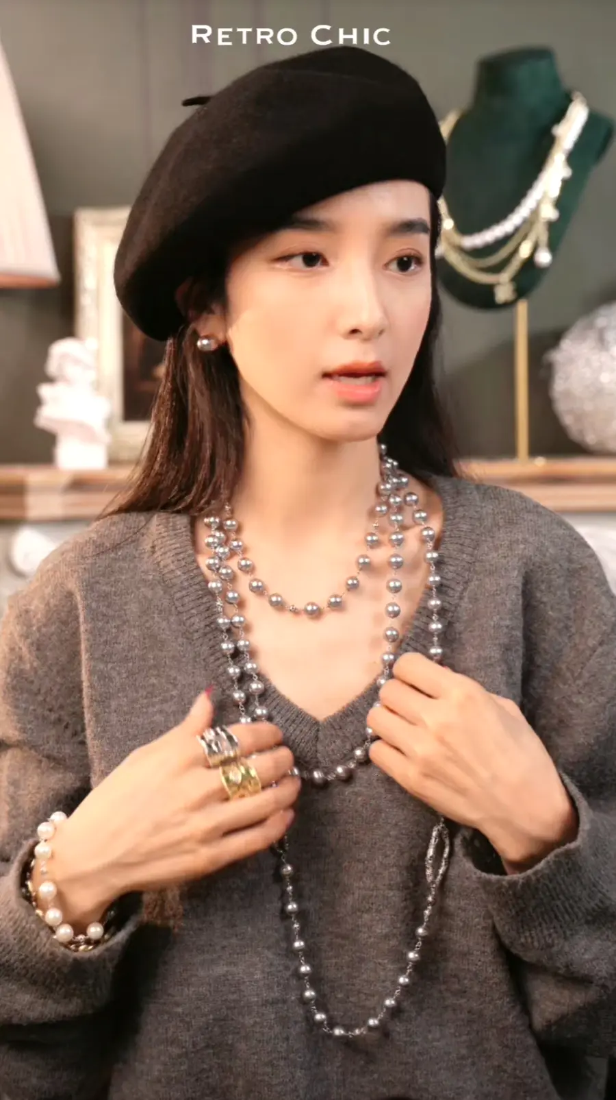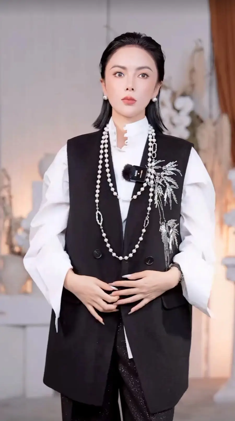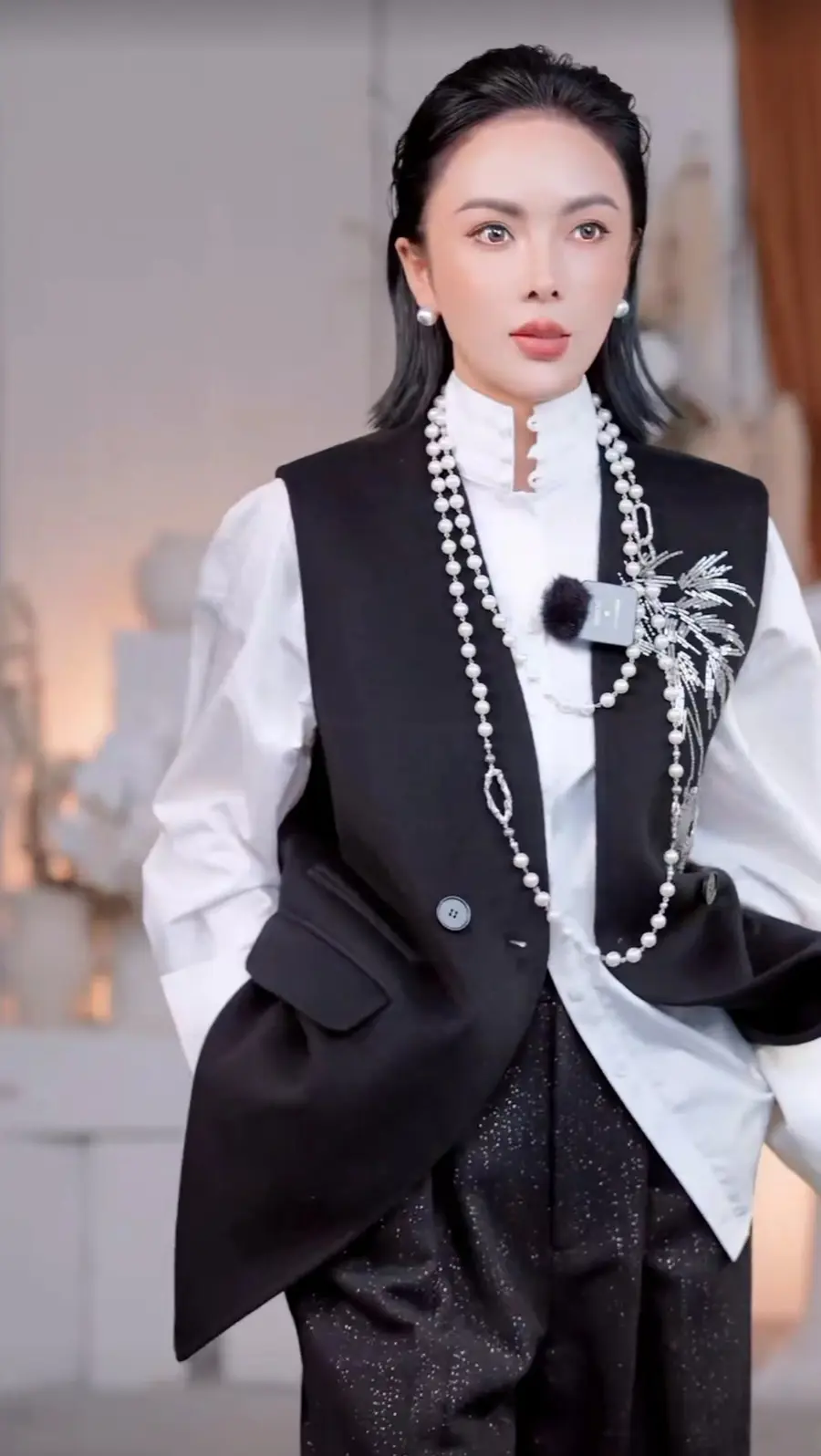 ▪ 珍珠项链轻轻勾勒颈部线条,为整体穿搭增添了一层婉约的气息。