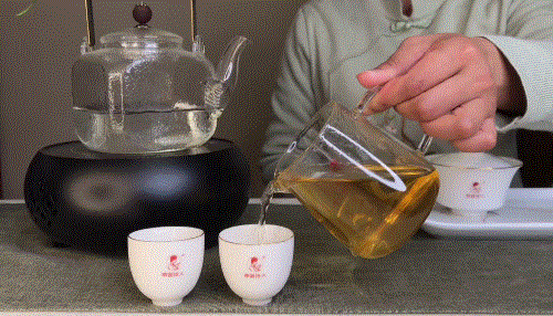 将茶汤从公道杯中分入品茗杯中,即可品饮。
