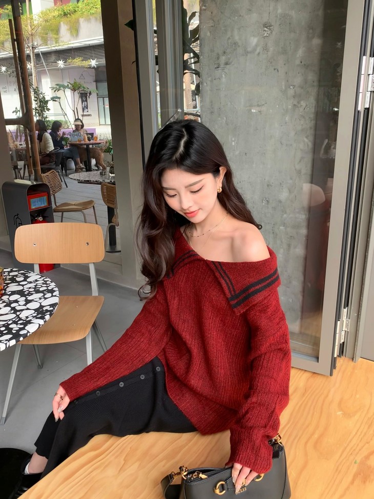 法式风红色一字肩毛衣,尽显甜美气质还很上镜