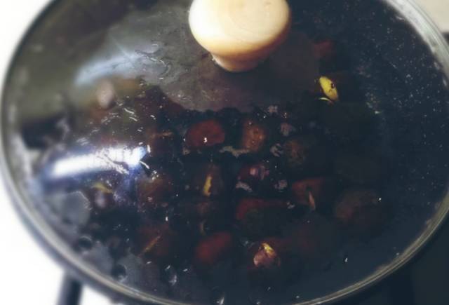 2、倒入8两开水(一定是开水),大火烧开,盖上锅盖焖5分钟,打开锅盖,锅中水已经烧干,此时板栗已经开口;