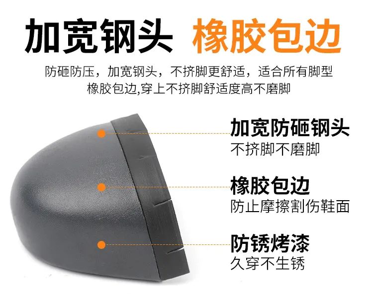更值得一提的是,加宽防砸钢头设计,橡胶包边防止摩擦割伤鞋面,防锈烤漆,久穿不生锈