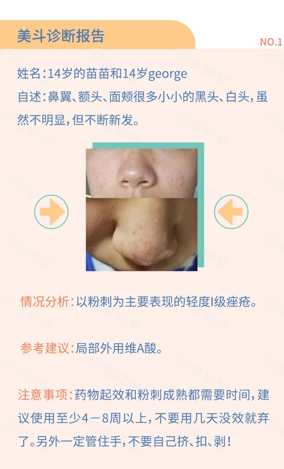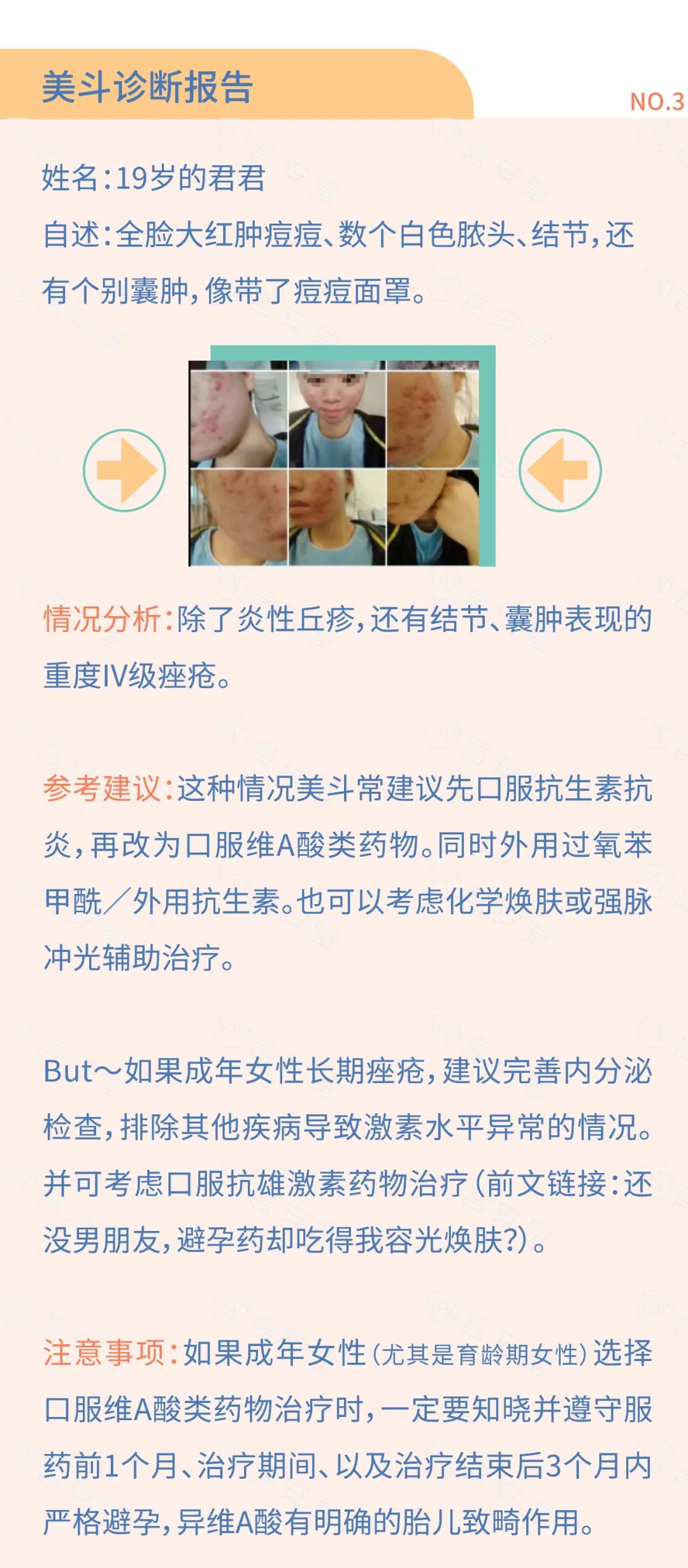 像小西西这样,以炎性丘疹为主要表现的痘痘(中度II级),如果初诊时,美斗通常会建议先外用药为主试试看,可以在外用维A酸的基础上,联合过氧苯甲酰或外用抗生素强化抗炎效果。如果外用药效果不理想,再考虑添加抗生素口服(多西环素及米诺环素常用),如果需要也可辅助医美治疗。