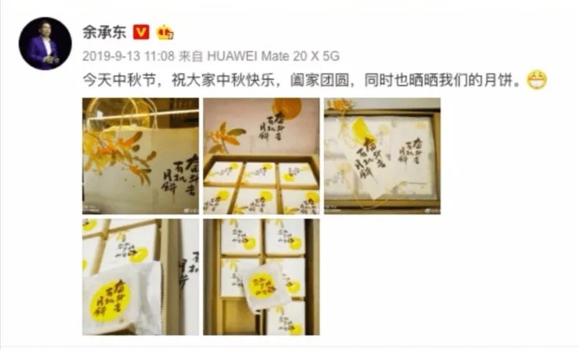 正谷多年为华为定制奋斗者有机月饼,华为常务董事余承东分享有机月饼。