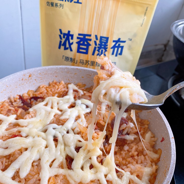 出锅后将芝士与腊肠米饭完美融合!一口超满足!悄悄的告诉你:制作的时候一定要加大量的奶酪碎!不然怕你不够吃😁~