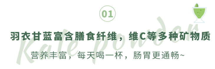 而这款羽衣甘蓝粉质非常细腻,兑水后色感更加翠绿,口感更加醇厚丝滑,养颜美容,营养丰富,能抗氧化,起到延缓皮肤衰.老的作用,每天喝一杯轻松拥有好气色,好身材。
