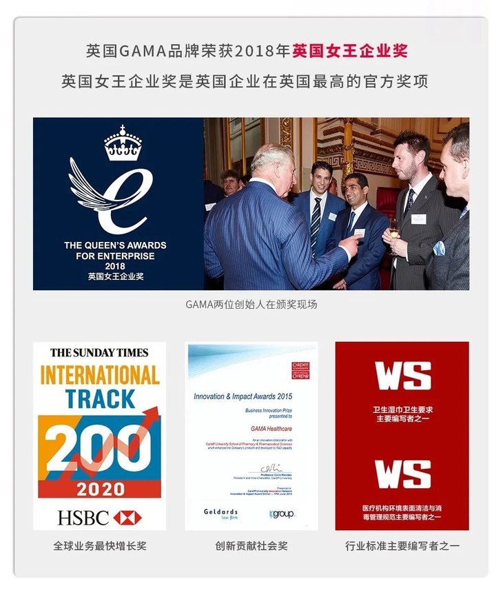伽玛品牌源自英国,由两位英国医生于2004年创立,专注研发感控产品,曾获英国女王奖、全球创新及影响力人民选择奖等多个奖项,也是杭州G20峰会指定使用品牌之一。