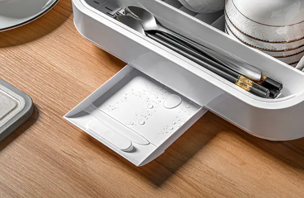 底下还加了条形沥水孔,洗完直接放,积水不滞留,不湿桌面,抽出接水盘就可以清理。如果你的家里还在随意放置湿漉漉的碗筷的话,可以给自己安排一个消毒碗柜,年末朋友来家里做客,有它更放心。