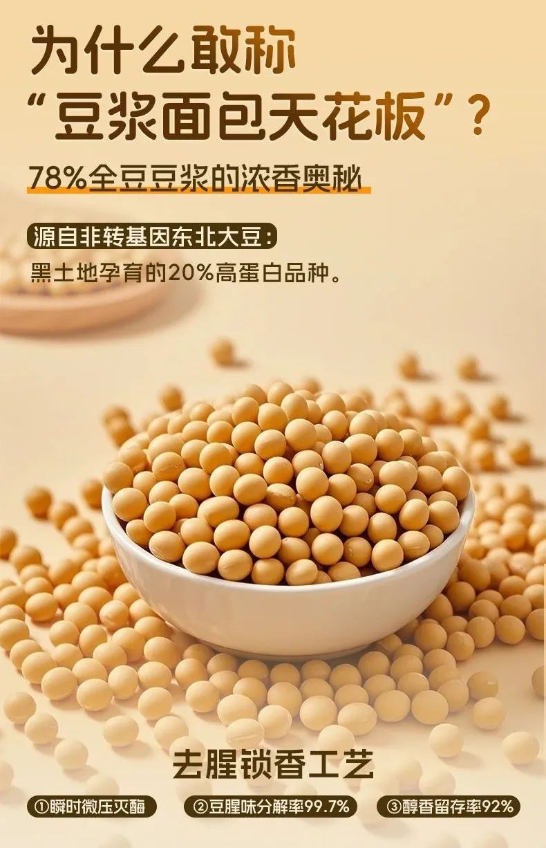 78% 豆浆含量:满满植物蛋白和膳食纤维,面包体既松软又带嚼劲;