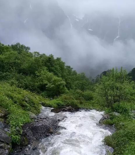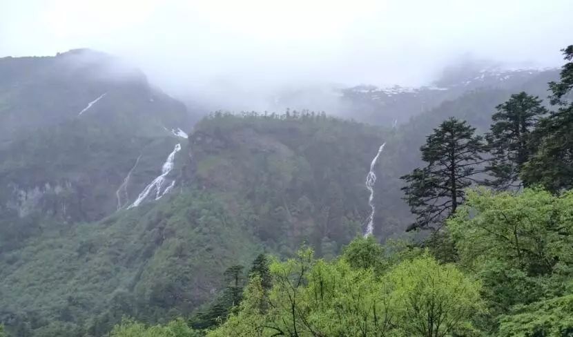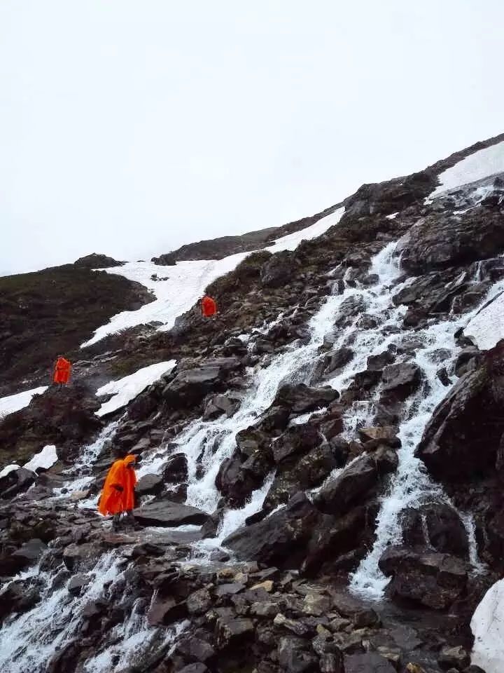 六月天气变暖,雪山融化,又落雨。下山,一路都在瀑布溪水中穿行