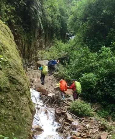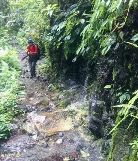沿途地貌植被、路况主要是:原始森林、溪水河流瀑布、湿滑乱石马道