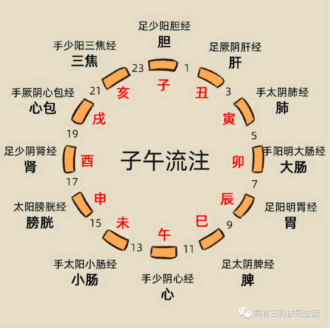 一天有十二个时辰,人体有十二条经络,每个时辰对应一条经络,气血每天流注一周,始于寅时所旺的肺经,终于丑时所旺的肝经,周而复始,循环往复。这个规律古人称为“子午流注”,用以指导治病和养生。