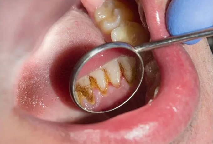 长时间清理不干净,牙菌斑、牙结石反复在牙齿上堆积了一层又一层。