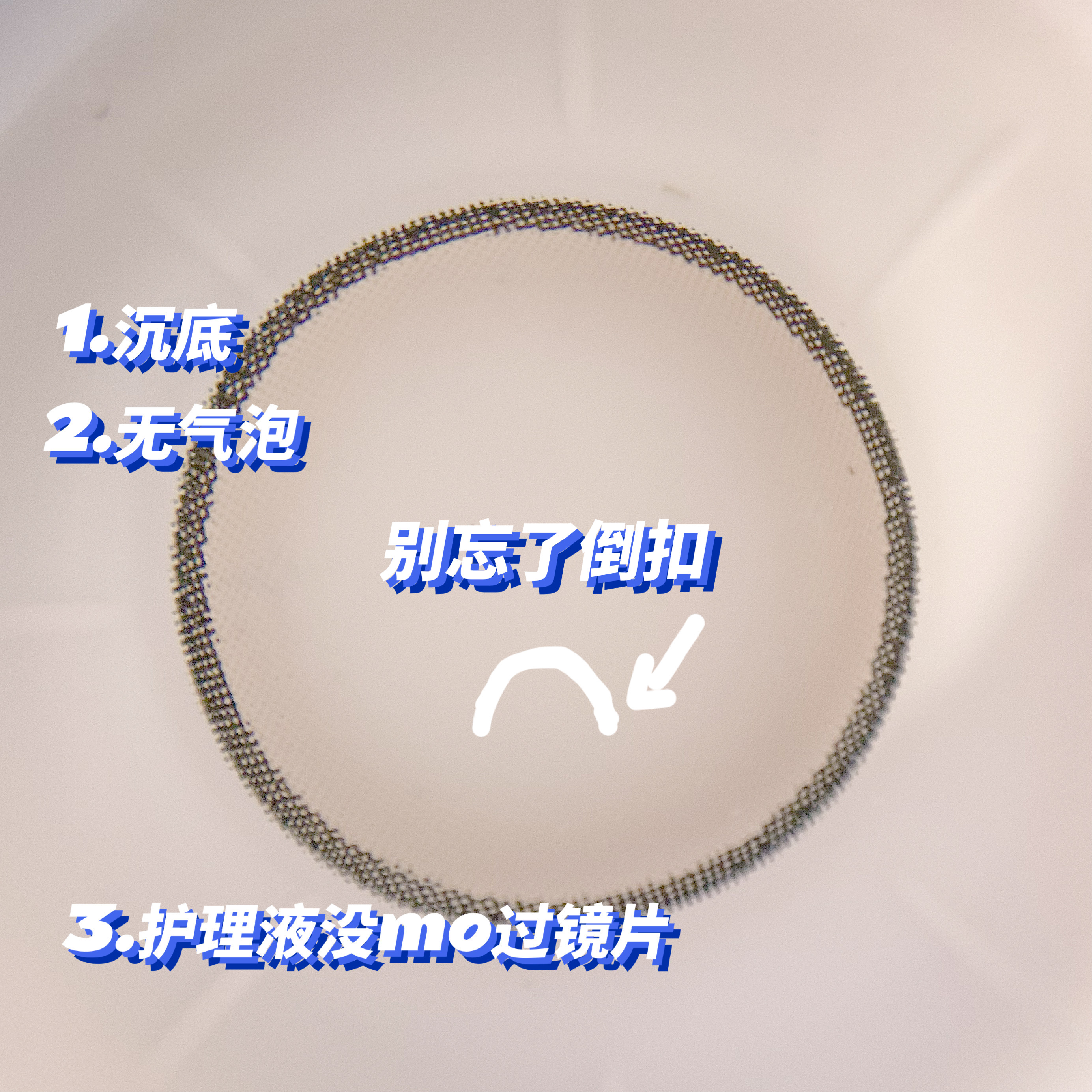 为防止美瞳被盖子无意间夹到导致镜片破裂,请将镜片倒扣在盒子里,沉入盒底,护理液请不要倒得太满,刚好没过镜片即可。